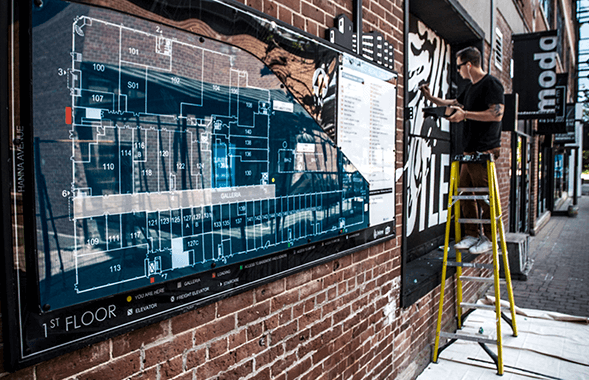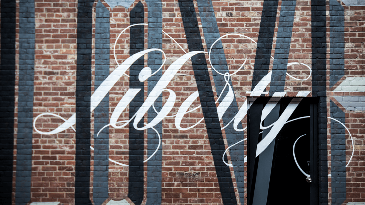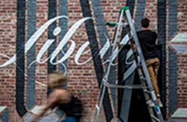 In June 2016 Lifetime Developments commissioned artist Ben Johnston to paint two large-scale murals within the Liberty Market Building’s Galleria that reflect the vibrancy, industrial history, and entrepreneurial culture of Liberty Village. These murals are strong statement pieces and capture the essence of the work hard, live well community, while showcasing Ben Johnston’s unique bold, vintage-inspired typographic flare. The two murals, Hustle and Love Liberty, are distinctly different and incorporate different surfaces, materials and feelings into their form.